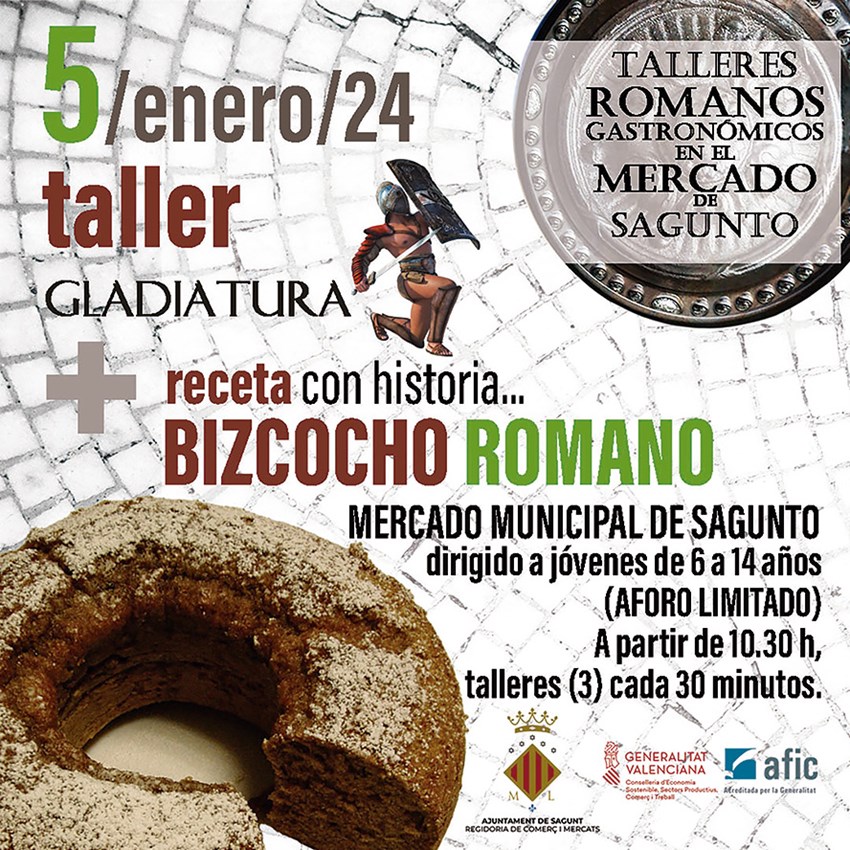 El viernes, 5 de enero, el Mercado Municipal de Sagunto acogerá cada media hora a partir de las 10.30 horas tres talleres de gladiatura que consistirán en la realización del bizcocho romano, el aforo del cual será limitado.