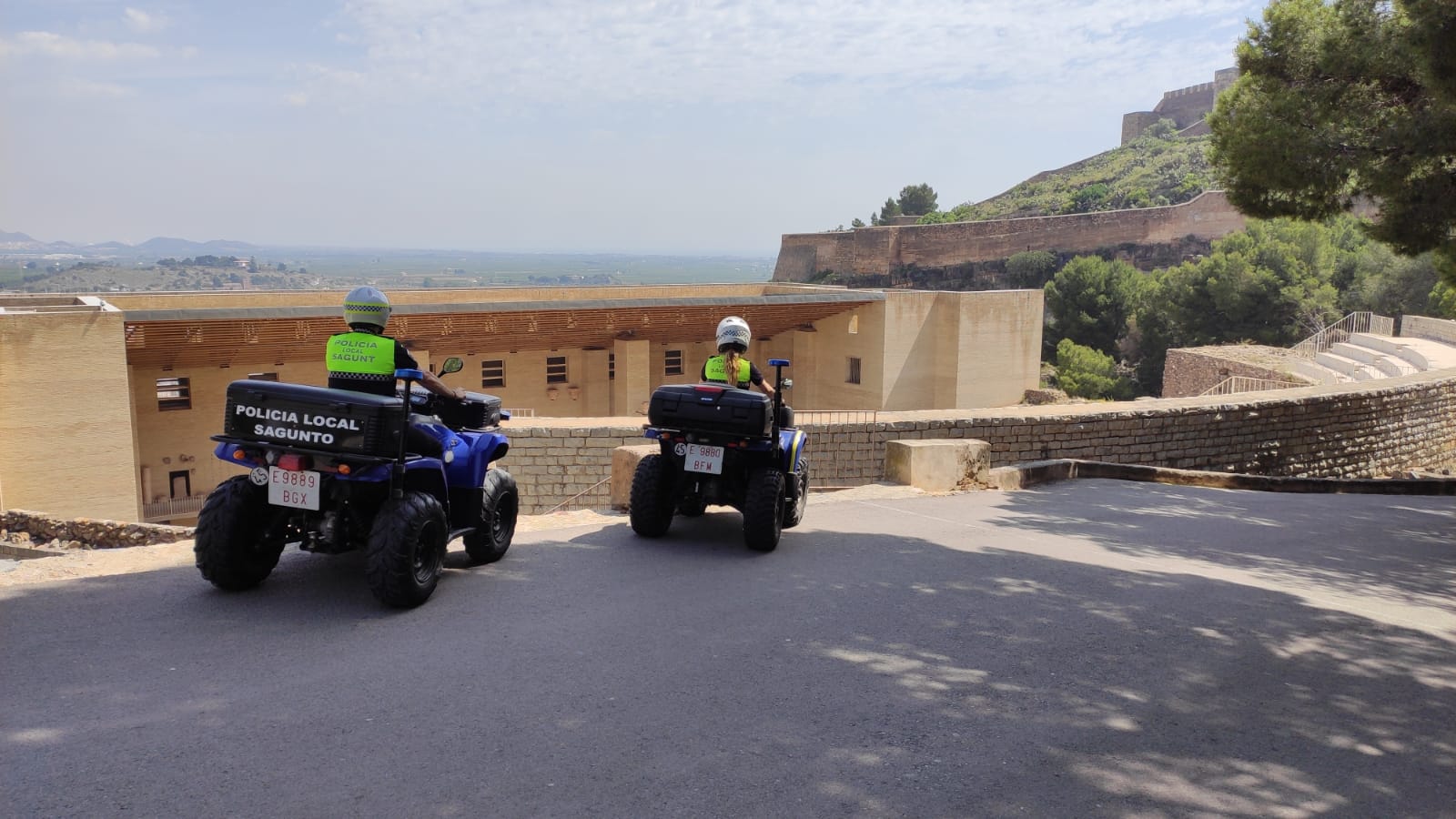 Dos agentes de la Policía Local de Sagunto vigilan las zonas de mayor concurrencia del municipio durante el estado de alarma.