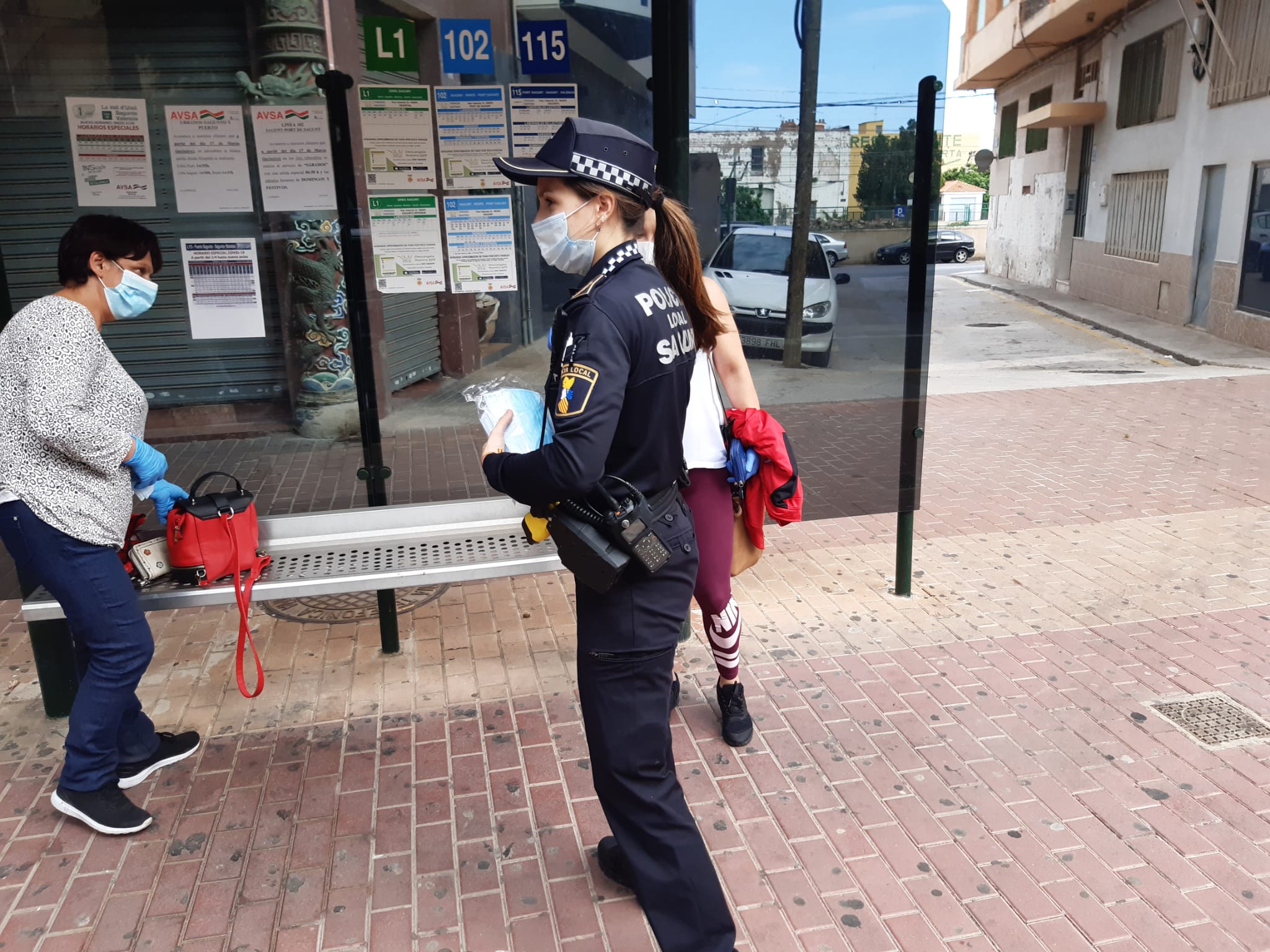 Agente de la Policía Local de Sagunto repartiendo mascarillas en una parada de autobús.