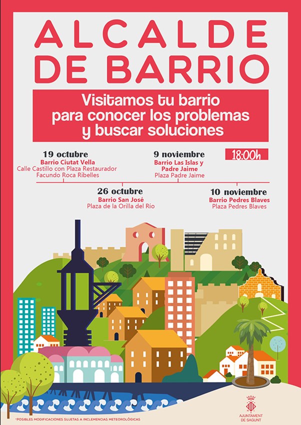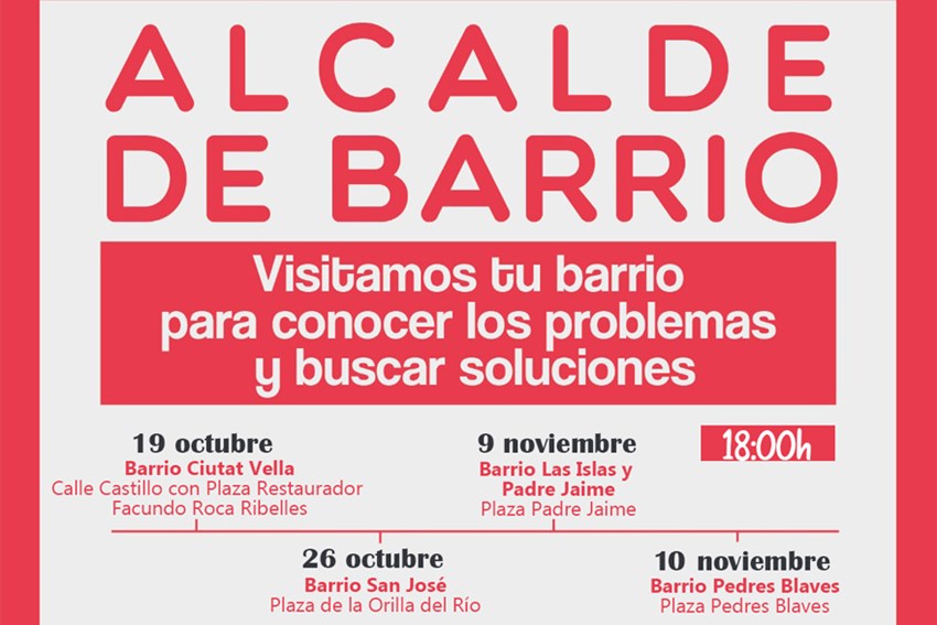 La iniciativa Alcalde de barrio continúa su andadura por los diferentes vecindarios del municipio de Sagunto mañana y pasado, días 9 y 10 de noviembre, en que el alcalde visitará los barrios de Las Islas y Padre Jaime y de Pedres Blaves.