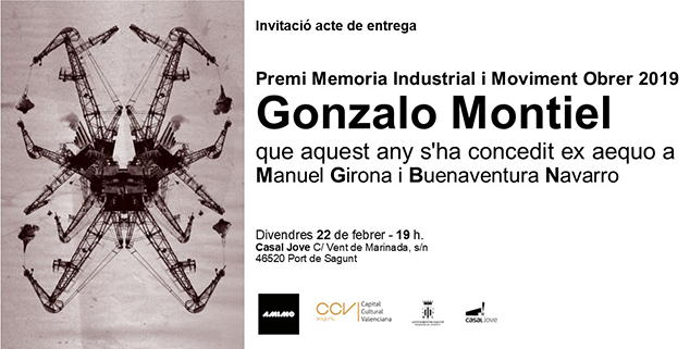 El Casal Jove de Puerto de Sagunto acogerá el próximo viernes 22 de febrero a las 19 h la entrega de los ‘Premios Memoria Industrial y Movimiento Obrero Gonzalo Montiel’. En esta tercera edición, AMIMO (Asociación Memoria Industrial y Movimiento Obrero) en colaboración con el Ayuntamiento de Sagunto, reconoce el trabajo de investigación y la puesta en valor de la memoria industrial y obrera de la localidad de los dos investigadores, Manuel Girona y Buenaventura Navarro.