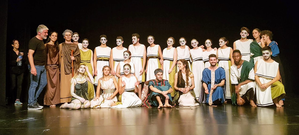 Por la tarde, fue el turno de talleres didácticos sobre arqueología con Mª Engracia Muñoz; de astronomía con Rafael García; de cerámica con Teresa Cases, de danzas griegas con José Ángel Santiago; de escritura con Manuel Moreno; y de teatro con Gemma López y José Luis Navarro. Para finalizar las jornadas, tuvo lugar el estreno de la obra en valenciano Antígona, por el grupo de teatro Komos del IES Marítim de València, dirigido por Miguel Navarro. La representación de la obra contó con público de diferentes colectivos de Sagunto.