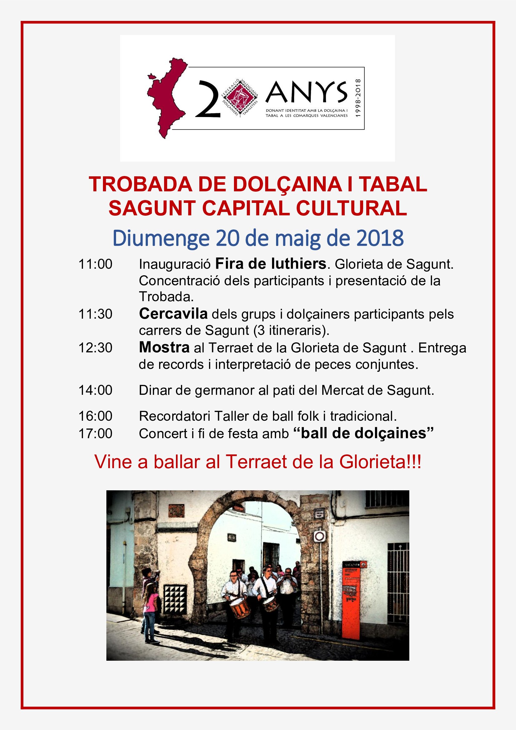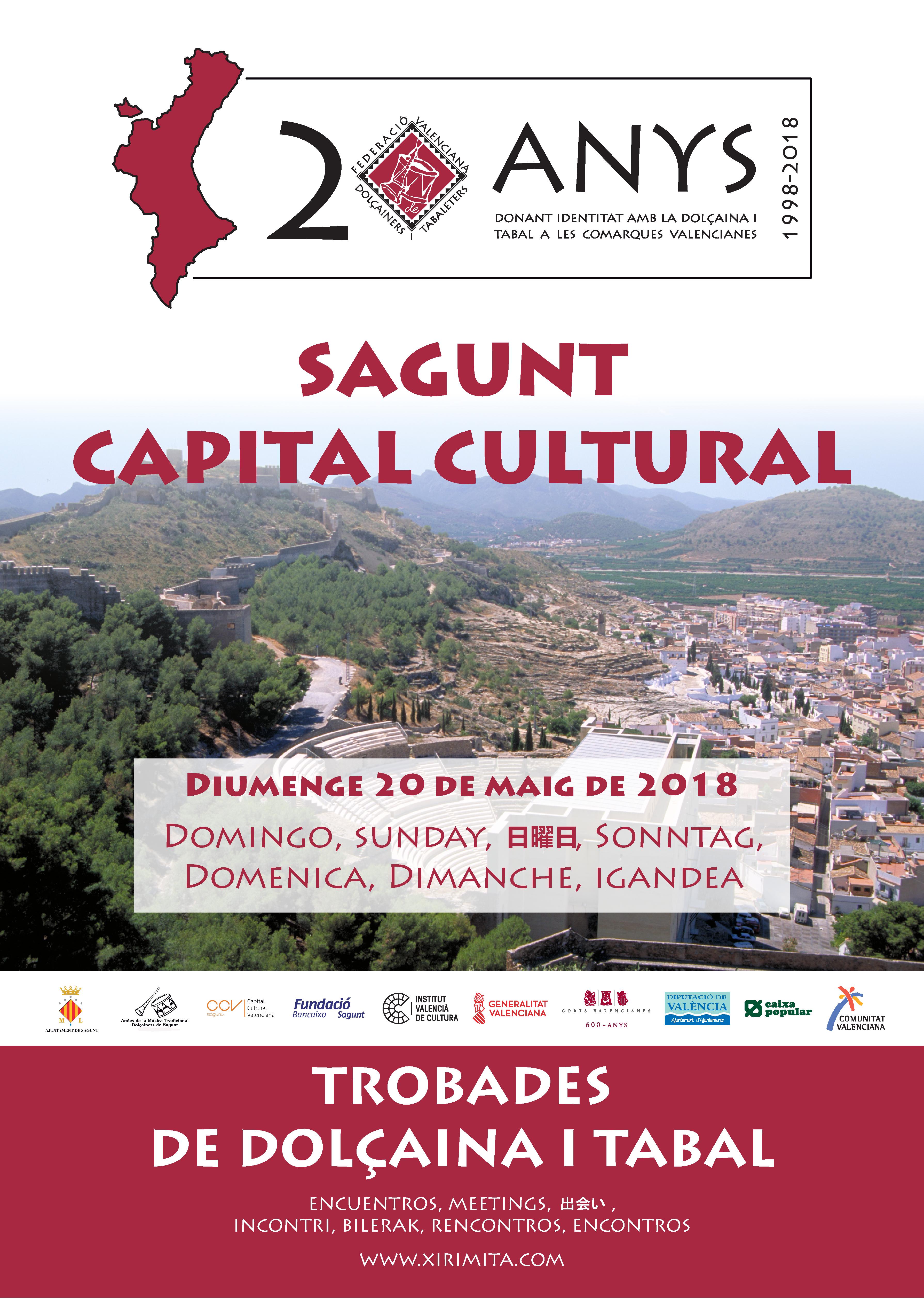 Este fin de semana Sagunto será la capital de la música valenciana con la celebración de los Encuentros de Dolçainers y Tabalaters que organiza la Federación Valenciana de Dolçainers y Tabaleters y en los que colabora la delegación de Cultura del Ayuntamiento de Sagunto. Desde el viernes 18 hasta el domingo 20 de mayo la localidad se llenará de músicos, amantes y expertos de la música tradicional valenciana de dulzaina y tabal en un evento que además sirve para conmemorar el 20 aniversario de la federación. Una mesa redonda con expertos de renombre, talleres gratuitos sobre música tradicional, pasacalles y conciertos de tabal y dulzaina completan este evento de música valenciana.