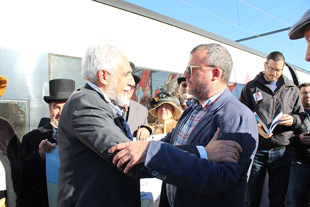 Perales anima a los ciudadanos a reclamar una línea en buenas condiciones: “esto es injusto, esta vía se cae, es un desastre, si nos descuidamos la van a cerrar. O la gente de base, los ciudadanos, nos movemos, o realmente nos jugamos el recorrido del ferrocarril”. El portavoz de Teruel Existe, acompañado de un gran número de visitantes ataviados de época, tras intercambiar impresiones con el alcalde de Sagunto ha retomado la marcha para continuar con la reivindicación siguiendo el recorrido Sagunto-Teruel-Calamocha-Cariñena-Zaragoza.