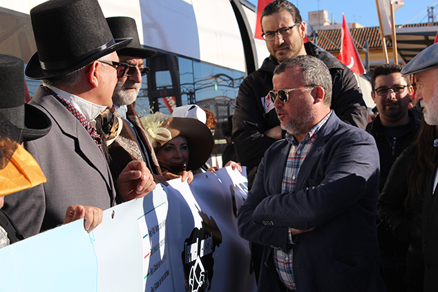 Con motivo del estado de la vía y las escasas inversiones recibidas en esta línea, los visitantes que reivindicaban desde Teruel lo han hecho vestidos de época. Ramón Perales, uno de los portavoces de la plataforma Teruel Existe, ha destacado “el hermanamiento que hay entre Teruel y Sagunto”, por ello asegura “que nos jugamos mucho los de Teruel y también la Comunidad Valenciana, especialmente Sagunto”. Perales señala que la única forma de conseguir lo que persiguen es “demostrar que estamos unidos ante una reivindicación que es de justicia y que tienen que resolver los políticos”.
