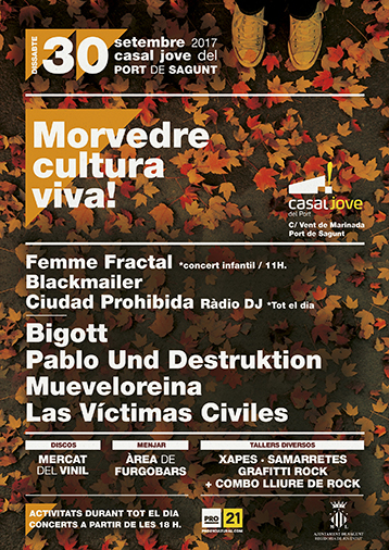“También hemos querido ampliar el espectro musical, pero sin abandonar la música independiente, con el pop/folk de Bigott, el cantautor de rock Pablo Und Destruktion, el trap de Mueveloreina, el rock-punk de los valencianos Víctimas Civiles, o la música indie de los locales Blackmailer. En resumen, un festival para toda la familia basado en la música independiente y en la cultura del directo, pero rodeado de más actividades vinculadas con la música, como el mercadillo de discos de vinilo, los talleres de chapas y camisetas, las charlas o la radio online de la mano del colectivo local Ciudad Prohibida”, ha detallado Sampedro.