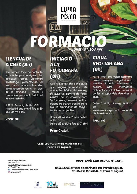 La concejalía de Juventud del Ayuntamiento de Sagunto tiene previsto ampliar y diversificar su programa de ocio alternativo para adolescentes, Lluna Plena, a partir de finales de abril y durante todo mayo. Con este objetivo, y con la intención de ofrecer un ocio que compagine formación y diversión, nace ‘Lluna Plena Formació’, con tres cursos dirigidos a jóvenes de entre 16 y 30 años, en horario de tarde. De momento, y de manera experimental, se ponen en marcha tres de los talleres que han solicitado los propios adolescentes en función de sus intereses, Fotografía, Cocina Vegetariana y Lengua de Signos, pero la idea, tal y como explica el concejal de Juventud, Guillermo Sampedro, “es ampliar a más talleres y cursos si este experimento funciona”.