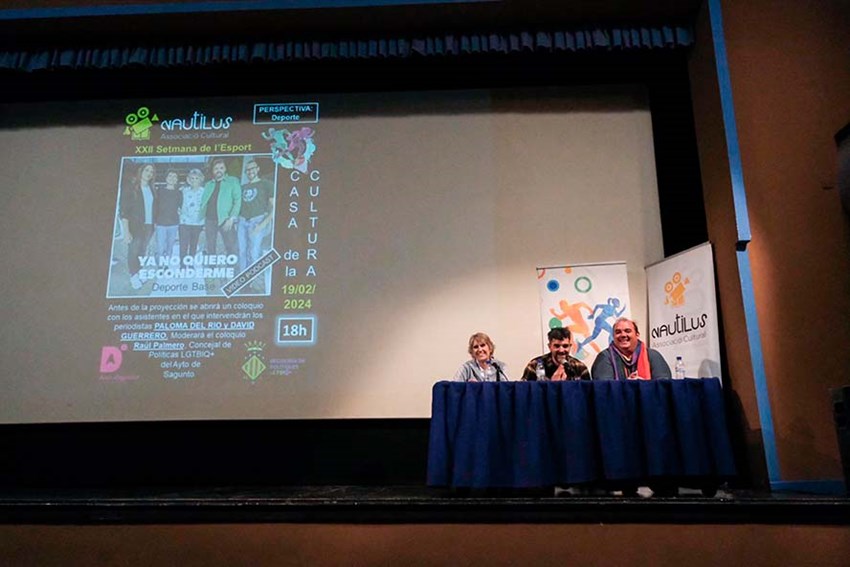 La asociación Nautilus ha proyectado el tercer capítulo de un video podcast dedicado al deporte base con el que muestran la realidad LGTBIQ+ en el deporte de España. Durante el evento también se han llevado a cabo dos coloquios abiertos en los que han participado los periodistas David Guerrero y Paloma del Río, así como el concejal de Políticas LGTBIQ+ del Ayuntamiento de Sagunto, Raúl Palmero, como moderador.