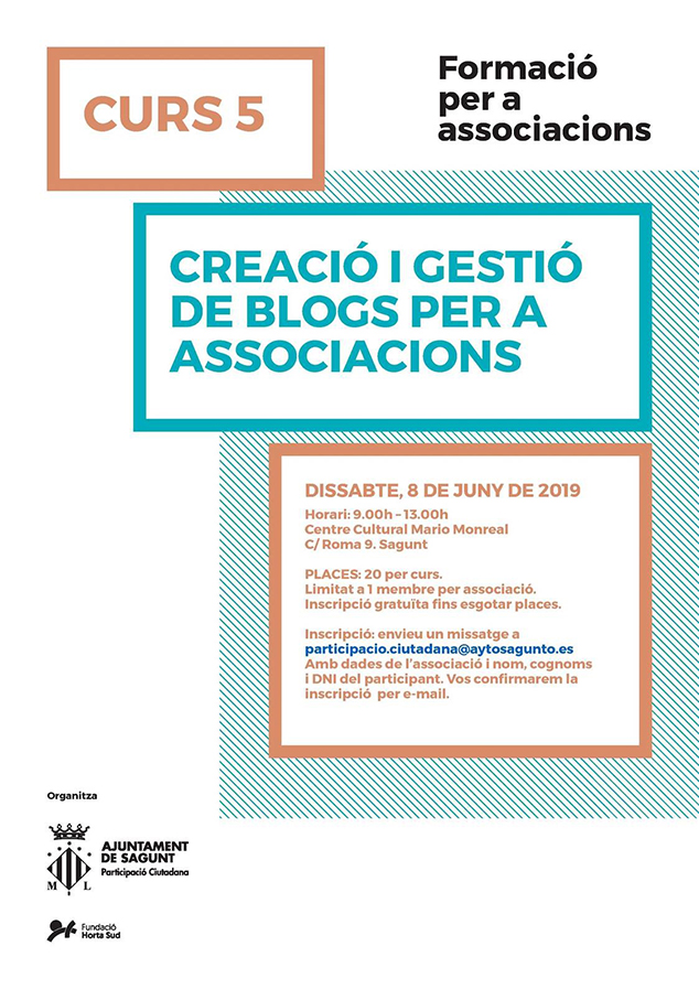 El ciclo de cursos de formación para asociaciones 2019 organizado por el departamento de Participación Ciudadana del Ayuntamiento de Sagunto llega a su fin con el quinto curso sobre Creación y gestión de blogs para las asociaciones que tendrá lugar el próximo sábado 8 de junio en el Centro Cultural Mario Monreal. Con este último curso se cerrará, hasta la próxima edición, un itinerario formativo en el que los principales destinatarios han sido los miembros de los órganos directivos y voluntarios de las asociaciones.