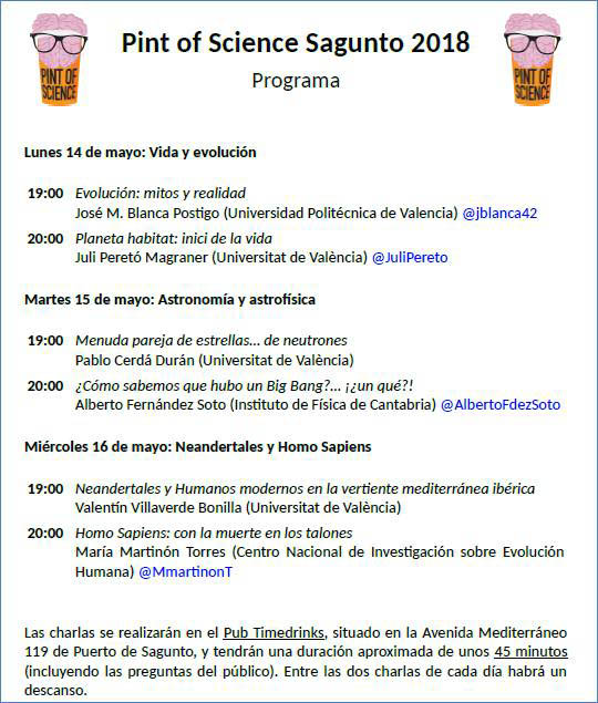 Los días 14, 15 y 16 de mayo tendrá lugar el festival Pint of sciencie en varias ciudades del mundo simultáneamente. Un evento que combina ciencia y cerveza a través de entretenidas charlas impartidas por científicos, y este año tratarán temas muy relevantes y actuales asociados al origen del universo, el origen de la vida y el origen del hombre. Sagunto se encuentra entra esas ciudades, gracias al colectivo local Sapiencia, y se celebrará en el pub Timedrinks ubicado en Puerto de Sagunto. Se realizarán dos charlas diarias, que tendrán comienzo a las 19 horas, donde cada charla tendrá una duración aproximada de media hora. El Gabinete de Comunicación del Ayuntamiento de Sagunto colabora en la difusión de estas jornadas con su publicación y emisión en streaming a través de la página web municipal (http://www.aytosagunto.es/es-es/Paginas/inicio.aspx) y el canal de YouTube (AytoSaguntoVideos), así como en sus redes sociales.