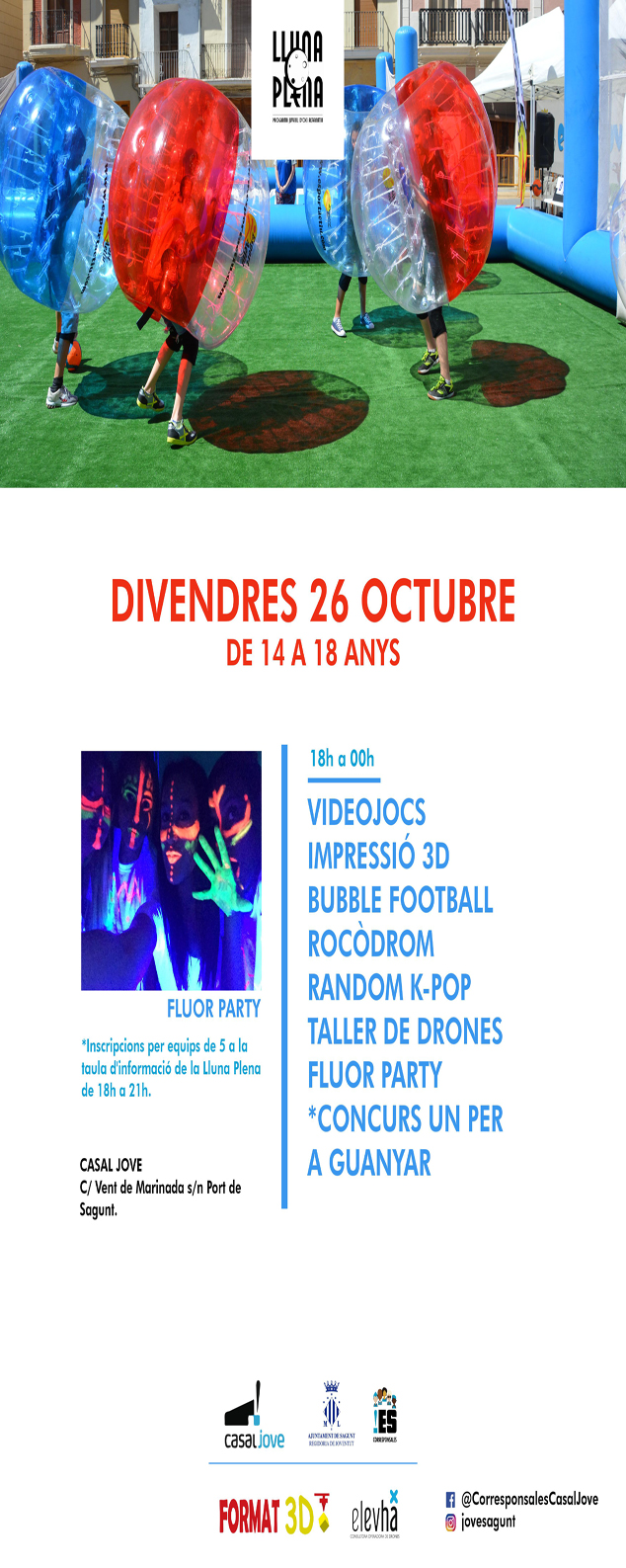El programa Lluna Plena se organiza por parte de la concejalía de Juventud con la colaboración de los corresponsales de los centros de secundaria. Y son los propios jóvenes de los institutos los que diseñan la programación, decidiendo los talleres y las actividades que se ofrecen por parte del departamento, como manera de que los adolescentes de Sagunto se empoderen.