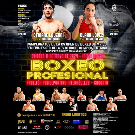 Los dos combates profesionales se disputarán sobre las 21:45 horas y tras estos enfrentamientos llegará el momento de la semifinal del Campeonato de la Comunidad Valenciana de Boxeo Olímpico en la categoría masculina y femenina. Clara López y Álvaro Ouaoua, ambos pertenecientes al Lord Boxing Puerto Sagunto Club, intentarán clasificarse para la fase final que se disputará el 1 de junio en Sueca. Sobre la presencia de boxeadoras el club de boxeo local, Javier Timón ha expresado: «También contamos con grandes boxeadoras, por lo tanto, hay que eliminar ese mito de que este pueda ser un deporte exclusivamente para hombres». A la medianoche tendrá lugar el broche final a esta velada de boxeo con el combate de Andrés Felipe Papasito Hernández.