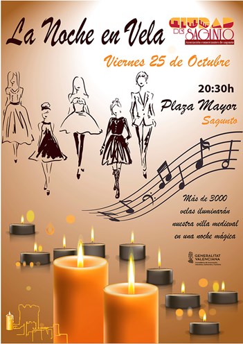 Aprovechando esta efeméride, la Asociación de Comerciantes Ciudad de Sagunto ha organizado la VIII edición de la ‘Noche en Vela’, en colaboración con la concejalía de Comercio y Mercados y con una subvención de la Generalitat Valenciana. Este evento comenzará en la plaza Mayor a las 19 horas con rutas guiadas y continuará a las 20:30 horas con un desfile de moda en el que la pasarela será la propia calle, que estará iluminada por 3.000 velas. Para hacer la noche aún más especial, el cuarteto de cuerda Candlelight amenizará el desfile de moda interpretando un concierto.