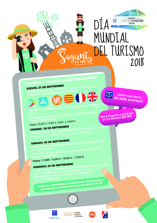 Sagunto se une a la celebración del Día Mundial del Turismo -DMT- 2018. Aunque este día se celebra el jueves 27 de septiembre, la delegación de Turismo del Ayuntamiento de Sagunto ha organizado actividades que se prolongarán durante todo el fin de semana. Bajo el lema ‘El turismo y la transformación digital’, el objetivo de estas jornadas es dar visibilidad a las ideas innovadoras capaces de revolucionar la forma en que viajamos y disfrutamos del turismo.