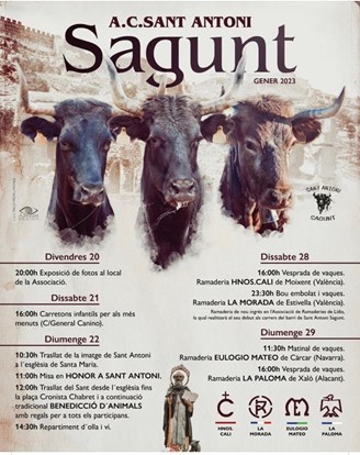 La Associació Cultural Sant Antoni de Sagunto también organiza una amplia programación de festejos. El viernes, 20 de enero, a las 20 horas, habrá una exposición fotográfica en el local de la asociación. El sábado, 21 de enero, a las 16 horas, habrá una actividad de “carretillas infantiles” para los más pequeños, que tendrá lugar en la calle General Canino. El domingo, 22 de enero, a las 10.30 horas, se trasladará la imagen de Sant Antoni a la iglesia de Santa María. A las 11 horas tendrá lugar una misa en honor en Sant Antoni y a las 12 horas se trasladará la imagen del santo desde la iglesia hasta la plaza Cronista Chabret. A continuación, se celebrará la tradicional bendición de los animales con regalos para todos los participantes. A las 14.30 finalizarán las actividades con el reparto de ollas y bebida para los colaboradores.