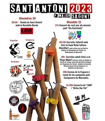 Desde la Associació Diabòlica de Morvedre han explicado en que consistirán los actos y han destacado que «están muy contentos y contentas de volver a la normalidad y que han hecho una programación teniendo mucho en cuenta a los pequeños». Así pues, el sábado, 21 de enero, a las 17 horas, habrá un concierto de rock para los más pequeños de la mano del grupo Els Estrellats. Posteriormente, a las 18.15 horas tendrá lugar un correfoc infantil que discurrirá desde el Camí Real y que contará con la Colla Jove del Ball de Diables de l'Hospitalet de l'Infant y la Diaboliqueta de Morvedre. A las 19 horas empezará el correfoc adulto desde la plaza Mayor con los Diables El Peirot de Tremp, la Colla Vella del Ball de Diables de l'Hospitalet de l'Infant, Diables de Castelló, Dimonis Socarrats de Campanar y la Diabòlica de Morvedre. A las 20 horas será la esperada encendida de la hoguera y el toque de campanas volteadas por los Campaners de Morvedre. Finalmente, a las 21.30 horas la clausura llegará con el concierto de 18M y Briks the Yet. Todas estas actividades están organizadas por la Associació Diabòlica de Morvedre i l’Associació Amics del Cavall en colaboración con el departamento de Fiestas del Ayuntamiento de Sagunto y otras asociaciones.