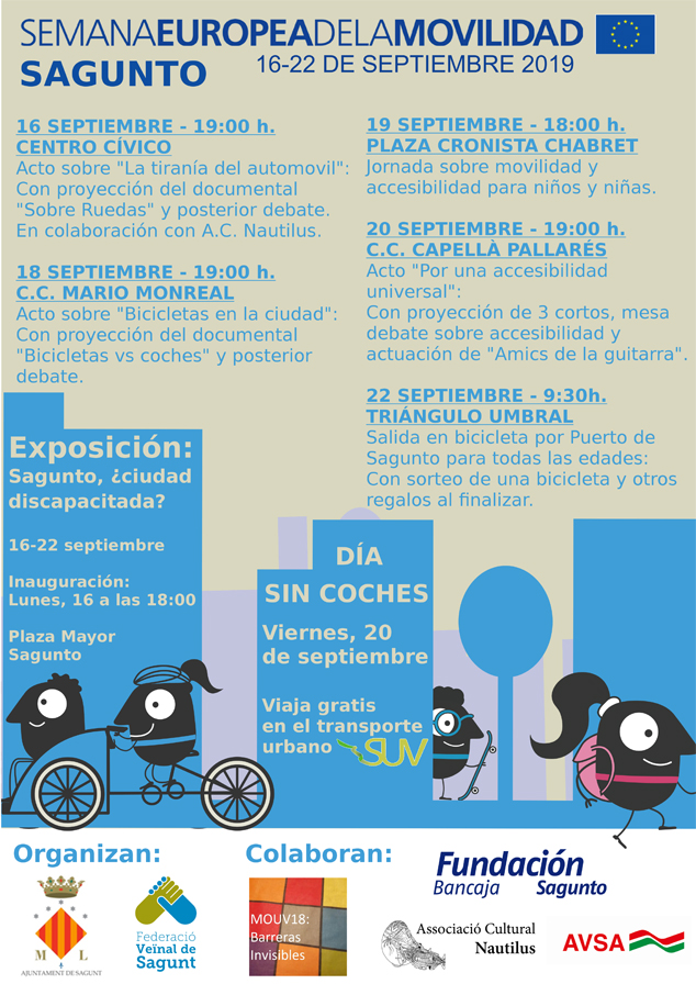 El lunes, 16 de septiembre, a las 18 horas tendrá lugar la inauguración de las jornadas con la exposición Sagunto, ¿ciudad discapacitada? en la Plaza Mayor que permanecerá abierta al público hasta el domingo 22 de septiembre. El mismo lunes a las 19 h, el Centro Cívico Antiguo Sanatorio acogerá el acto La tiranía del automóvil, que constará de la proyección del documental Sobre ruedas y un debate con la colaboración de la Asociación Cultural Nautilus. El miércoles, 18 de septiembre, a partir de las 19 h tendrá lugar el acto sobre Bicicletas en la ciudad con la proyección en el Centro Cultural Mario Monreal del documental Bicicletas vs coches y el posterior debate. Los niños y niñas también podrán disfrutar de actividades esta semana dedicada a la movilidad urbana. Será el jueves 19 de septiembre, a partir de las 19 horas, en una Jornada sobre Movilidad y Accesibilidad que tendrá lugar en la plaza Cronista Chabret.
