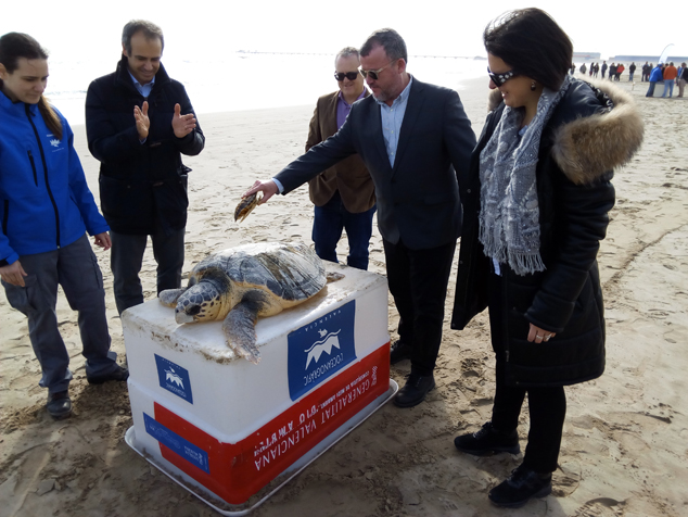 Hemos tenido a 600 o 700 niños y niñas de las escuelas para soltar dos tortugas que se han recuperado en el Oceanogràfic y que fueron capturadas en las redes por los pescadores y que no podían vivir si no eran tratadas. Estas tortugas las hemos bautizado, a una le hemos puesto Saguntina, por la ciudad, y a la otra le hemos puesto Federica, por nuestro amigo fotógrafo que ha desaparecido recientemente y que ha trabajado en la exposición ‘Fets d’Aigüa’ que hoy hemos clausurado”.