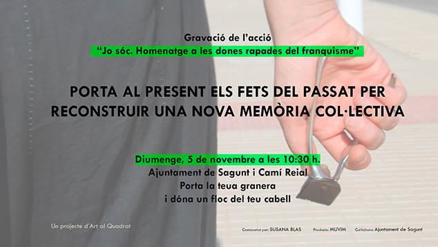 El próximo domingo 5 de noviembre a las 10.30 horas en el Ayuntamiento de Sagunto y en el Camí Reial se realizará una acción/homenaje a las mujeres que fueron rapadas en Sagunto durante el franquismo. Bajo el lema “Yo Soy…”, este acto dirigido por el dúo artístico Art al Quadrat no sólo trata de homenajear a estas mujeres por las vejaciones sufridas, sino que también busca reescribir la experiencia de una manera colectiva desde el presente.