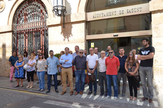 ​​La localidad de Sagunto se solidariza con las víctimas del atentado de Niza en un minuto de silencio. El acto para mostrar apoyo al pueblo francés se ha realizado a mediodía en las puertas de los edificios públicos municipales y ha contado con la presencia de varios concejales, trabajadores municipales y ciudadanos locales.
