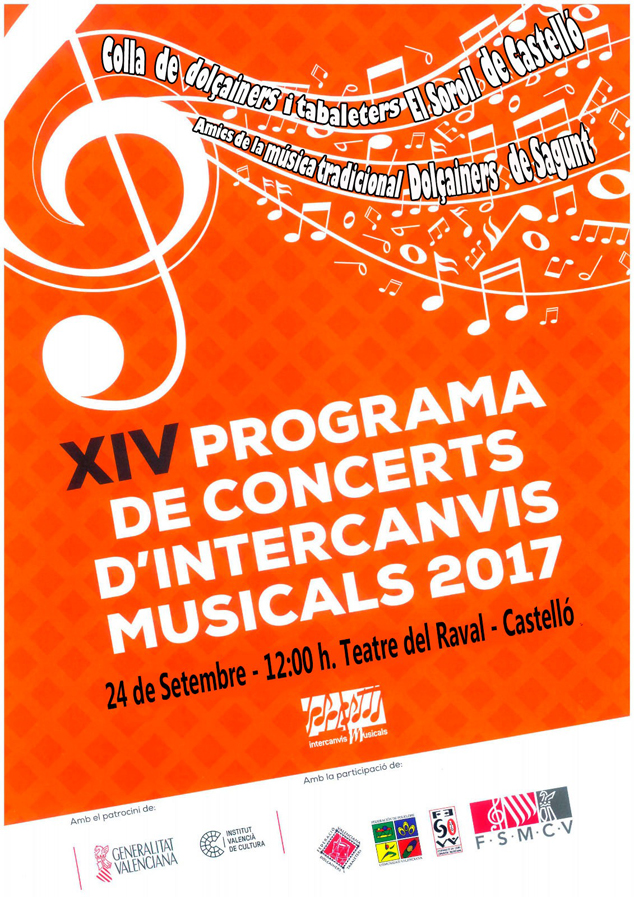 El próximo domingo, 24 de septiembre, tendrá lugar una jornada de intercambio y y conciertos entre la asociación ‘Amics de la Música Tradicional. Dolçainers de Sagunt’ y la ‘Colla de dolçainers i tabaleters El Soroll’ de Castellón. Se trata de una jornada enmarcada dentro de la XIV Campaña de Intercambios 2017, patrocinada por el Instituto Valenciano de Cultura.