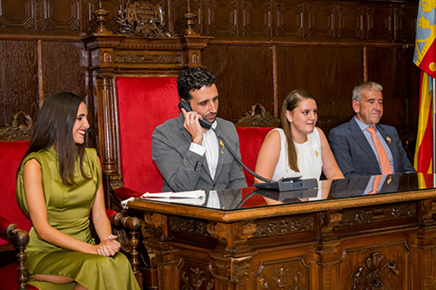Tras el acto público, candidatas y jurados comieron juntos para posteriormente proceder con las entrevistas personales. El momento más emocionante y esperado llegó cuando el alcalde de Sagunto, Darío Moreno, realizó la llamada desde el Salón de plenos del consistorio a las candidatas elegidas, acto presidido por las actuales Falleras Mayores, Inés Miret y Paula Marrón.