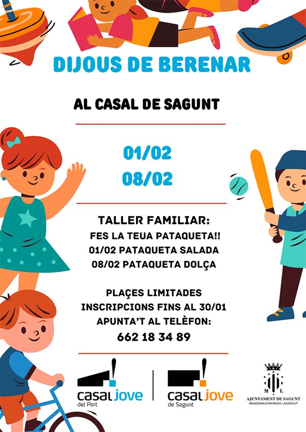 Los talleres se han promovido con motivo del Dijous de Berenar. El 1 de febrero se llevarán a cabo pataquetas saladas y el 8 de febrero se realizarán pataquetas dulces. Este taller es gratuito y la inscripción se puede realizar hasta el 30 de enero a través del número de teléfono 662 18 34 89 o acudiendo al Casal Jove de Sagunto.