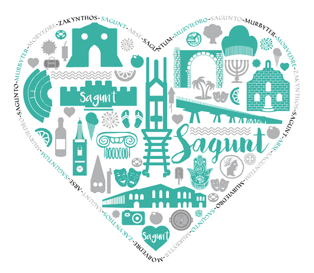 También se ha diseñado un logo en forma de corazón, que viene en todos los artículos de promoción y folletos. La imagen está formada por elementos del municipio destacables para los turistas, como el Castillo, el Teatro Romano, el Alto Horno o el pantalán, entre otros. Además, el ribete del corazón está formado por los distintos nombres históricos de la ciudad.