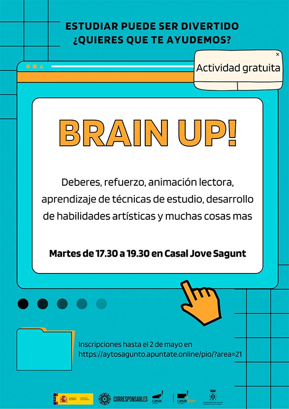 El Casal Jove de Sagunto, recientemente inaugurado y cofinanciado por el fondo FEDER de la Unión Europea, estrena Brain Up!, la nueva actividad de refuerzo escolar que se lleva a cabo desde la concejalía de Juventud e Infancia del Ayuntamiento de Sagunto.