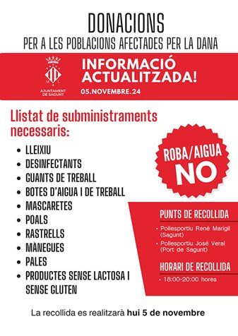 L'Ajuntament de Sagunt comunica que reprén la recollida de productes per a donar als municipis afectats per la DANA. Després de la donació massiva del passat cap de setmana, el consistori va paralitzar temporalment la recollida, a petició de les zones afectades, que es trobaven desbordades de subministraments. No obstant això, en este moment, tornen a sol·licitar productes de neteja, equips de protecció individual, ferramentes i aliments sense lactosa ni gluten.