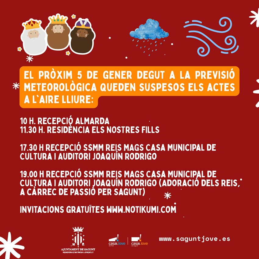 L'Ajuntament de Sagunt ha decidit reubicar les cavalcades i els tradicionals actes del 5 de gener per a rebre SSMM els Reis d’Orient. Al matí, el mal oratge fa que se suspenga enguany la seua arribada al port marítim amb vaixell. En canvi, sí que es mantenen durant el matí les visites reials als barris de Baladre i Almardà, així com a la residència Nuestros HIjos.