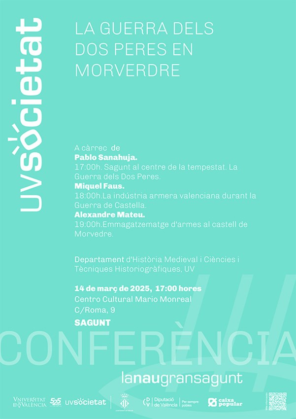 La jornada de divulgació sobre la Guerra dels Dos Peres començarà a les 17 hores amb la conferència del doctor Pablo Sanahuja titulada Sagunto en el centro de la tempestad. La Guerra de los Dos Pedros. A continuació, Miquel Faus aprofundirà sobre La industria armera valenciana durante la Guerra de Castilla (18 hores) i Alejandro Mateu posarà el colofó a l'esdeveniment amb una ponència sobre Almacenamiento de armas en el castillo de Morvedre (19 hores).
