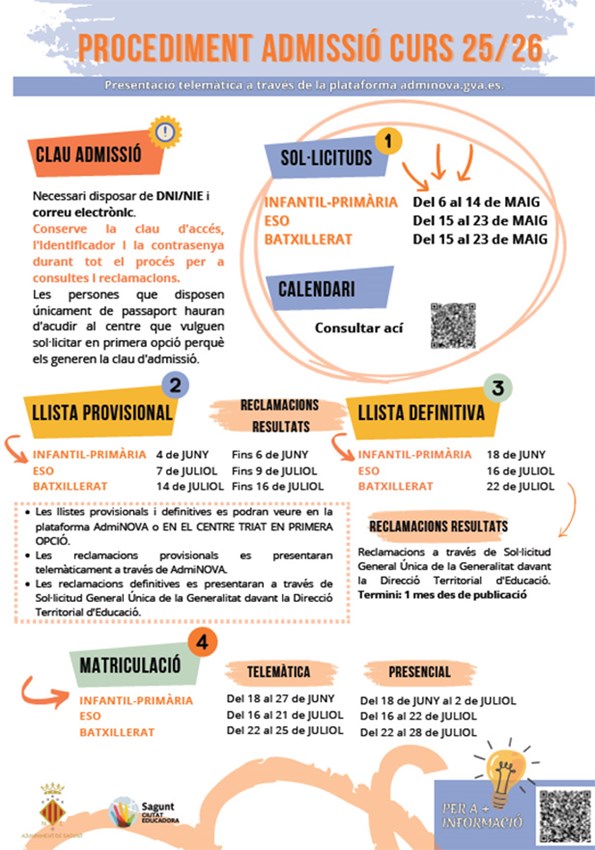 Les llistes provisionals d'admissió per als cicles d'Infantil i Primària es publicaran el dia 4 de juny, les d'ESO es coneixeran el 7 de juliol i les de Batxillerat el 14 de juliol. El termini de reclamacions serà fins al 6 de juny, el 9 de juliol i el 16 de juliol respectivament; i les llistes definitives eixiran el 18 de juny per a Infantil i Primària, el 16 de juliol per a Secundària i el 22 de juliol en el cas de Batxillerat.