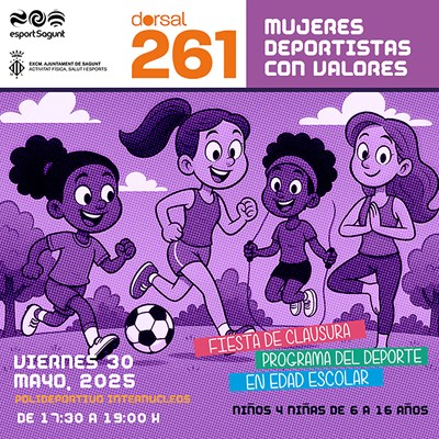 El programa de la Regidoria d'Activitat Física, Salut i Esports, ‘Esport en Edat Escolar’, celebra la seua festa de clausura el divendres 30 de maig de 17 a 19 hores al Poliesportiu Municipal (internuclis) amb el lema “Dones amb valors”. L'activitat està dirigida a menors d'entre 6 i 16 anys i també inclou el programa de foment de la igualtat en l'esport Dorsal 261.