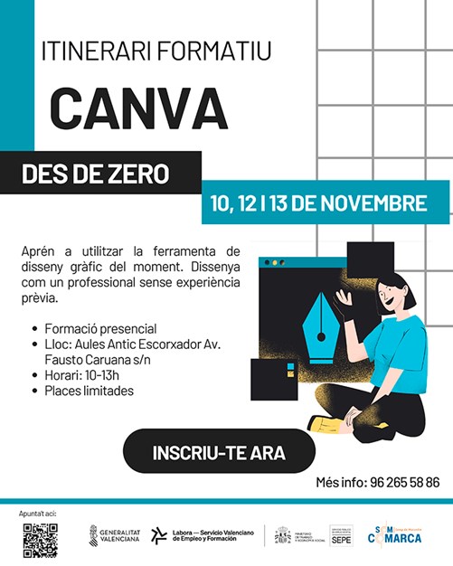 La programació formativa de l'àrea de Promoció Econòmica també inclou la segona edició de Canva des de zero, un curs presencial de 9 hores de duració amb el qual aprendre a dominar esta ferramenta de disseny gràfic de manera pràctica i senzilla. Este curs està programat el 10, 12 i 13 de novembre entre les 10 i les 13 hores en el nou aulari de l'antic escorxador. Les persones assistents a la formació hauran de portar a les classes un ordinador portàtil. Si li interessa participar en este itinerari formatiu pot inscriure's a través d'este formulari en línia.