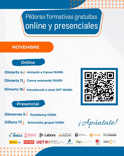 Cal destacar també dues sessions formatives que es duran a terme de manera presencial en el nou aulari de l'antic escorxador (av. Fausto Caruana s/n, al costat de les oficines de la SAG del Port de Sagunt): Portalemp (5 de novembre – 11 hores) i Entrevista grupal (17 de novembre – 11 hores).