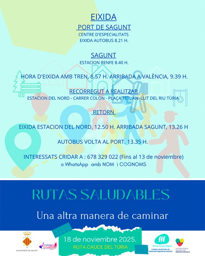 L'acció ‘Rutes Saludables’ de la Regidoria de Serveis Socials es reprén després de l'època estival. En esta ocasió, l'eixida tindrà lloc dimarts que ve 18 de novembre realitzant-se un recorregut per la ciutat de València, des de l'Estació del Nord passant pel carrer Colón fins a arribar a la plaça Tetuan i acabant en el llit del riu Túria.