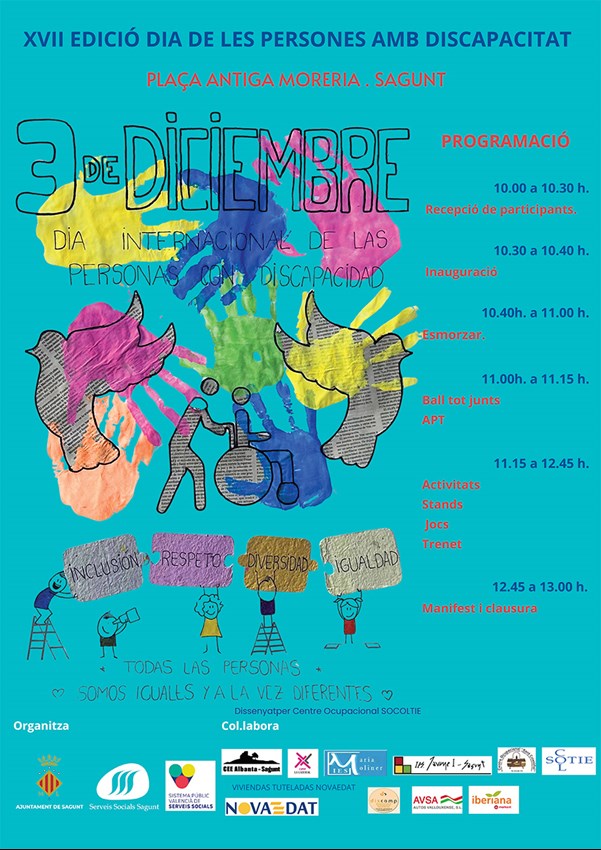 L'Ajuntament de Sagunt, a través de la Regidoria de Serveis Socials, celebra un any més el Dia Internacional de les Persones amb Discapacitat, que es commemora el dimecres 3 de desembre. Eixe dia a partir de les 10.30 hores es duran a terme diverses activitats A la plaça de la Moreria de Sagunt en la XXII edició d'esta celebració.