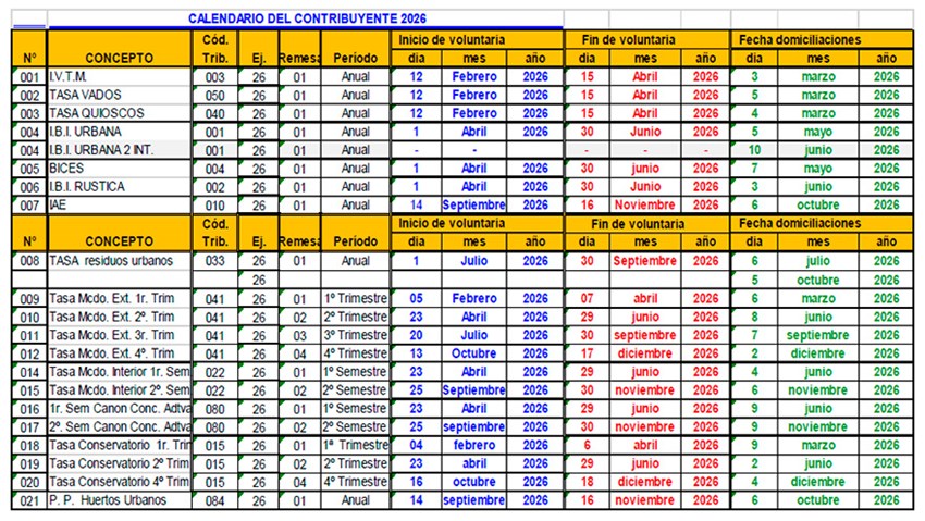 El 4 de febrer començarà el termini per a abonar el pagament del primer trimestre de la taxa de Conservatori, que acabarà el 6 d'abril. Després, el dia 5 començarà el termini per a pagar el primer trimestre de la taxa del Mercat Exterior, i acabarà el 7 d'abril. El 12 de febrer començarà el termini per a pagar l'Impost de Vehicles de Tracció Mecànica (IVTM), la taxa de Guals i la taxa de Quioscos, i finalitzarà el 15 d'abril.
