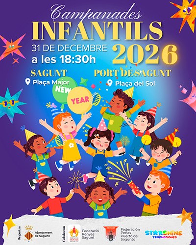 En esta ocasió, a les 18.30 hores se celebraran les campanades infantils per als xiquets i xiquetes de la ciutat. A Sagunt, seran a la plaça Major i, al Port de Sagunt, a la plaça del Sol.