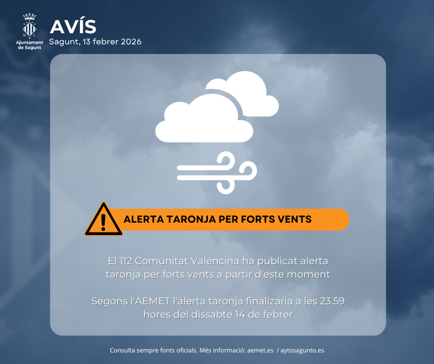 El 112 Comunitat Valencina ha publicat alerta taronja per forts vents a partir d'este moment. S'esperen vents generalitzats de component nord-oest que puntualment podrien arribar als 90 quilòmetres per hora. Segons AEMET, l'alerta és per a tota la jornada del dissabte 14 de febrer fins a les 23.59 hores. Es suspenen també les actividad a l'aire lliure.