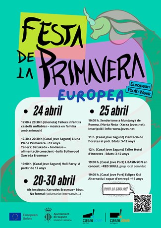 La Regidoria de Joventut i Infància de l'Ajuntament de Sagunt organitza la segona edició de la Festa de la Primavera, en la qual els grups de participació juvenils i el voluntariat jove estaran presents en les activitats de manera activa. En esta ocasió té a Europa com a tema central en coincidir amb la Setmana Europea de la Joventut.