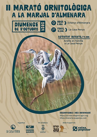 Acció Ecologista-Agró comença la programació tardorenca d'activitats a La Casa Penya amb la II Marató ornitològica de la marjal d'Almardà-Almenara. La jornada per a gaudir i descobrir els tresors naturals d'esta zona d'aiguamolls tindrà lloc diumenge que ve 6 d'octubre. Cal esmentar la col·laboració de l'Ajuntament de Sagunt, així com el suport de Caixa Popular i l'associació Grup Au d'Ornitologia.