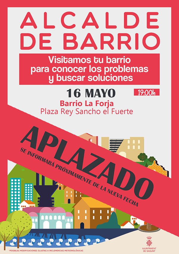 El departament de Participació Ciutadana i l'Alcaldia de l'Ajuntament de Sagunt informen que la trobada de la iniciativa Alcalde de Barri previst per a esta vesprada en el barri La Forja queda ajornat fins a un altre avís. La nova data s'anunciarà pròximament com més prompte millor.