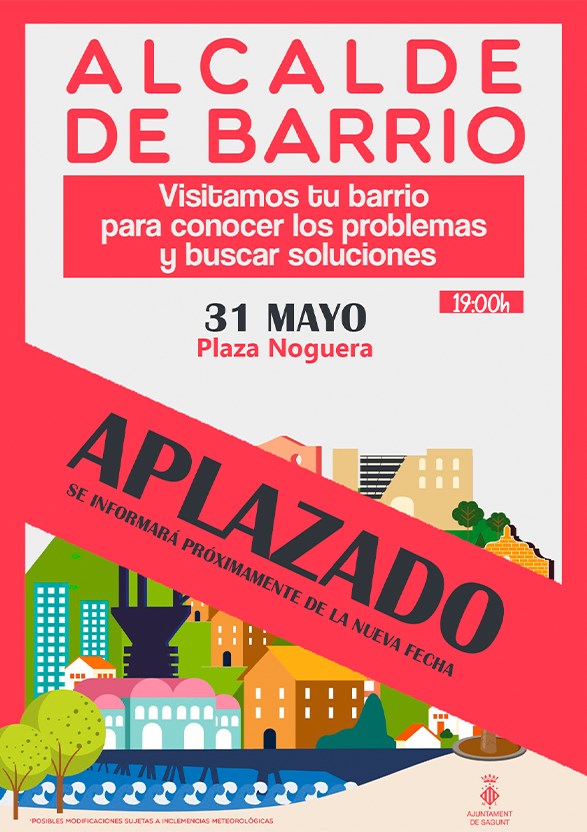 El departament de Participació Ciutadana i l'Alcaldia de l'Ajuntament de Sagunt informen que la trobada de la iniciativa Alcalde de Barri previst per a hui, 31 de maig, en la plaça Noguera queda ajornada fins a un altre avís. La nova data s'anunciarà pròximament com més prompte millor.