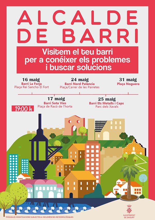 La iniciativa Alcalde de Barri, impulsada pel departament de Participació Ciutadana i l'Alcaldia de l'Ajuntament de Sagunt, ha publicat el calendari de les seues pròximes trobades previstes per a la segona quinzena d'este mes de maig, en la qual visitarà cinc zones del municipi, sempre a les 19.00 hores.