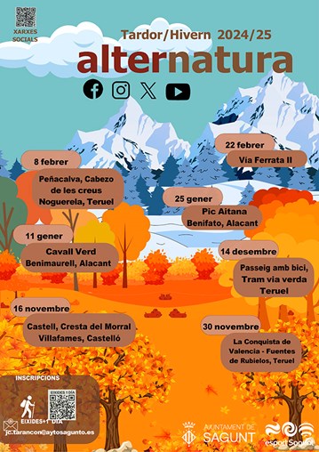 La regidoria d'Activitat Física, Salut i Esports ha presentat les set excursions que conformen la programació d’Alternatura per a la temporada de tardor-hivern. La majoria de les activitats consistixen en rutes de senderisme i ascensos a pics de muntanyes, però també s'han inclòs una via ferrata i un passeig amb bicicleta.