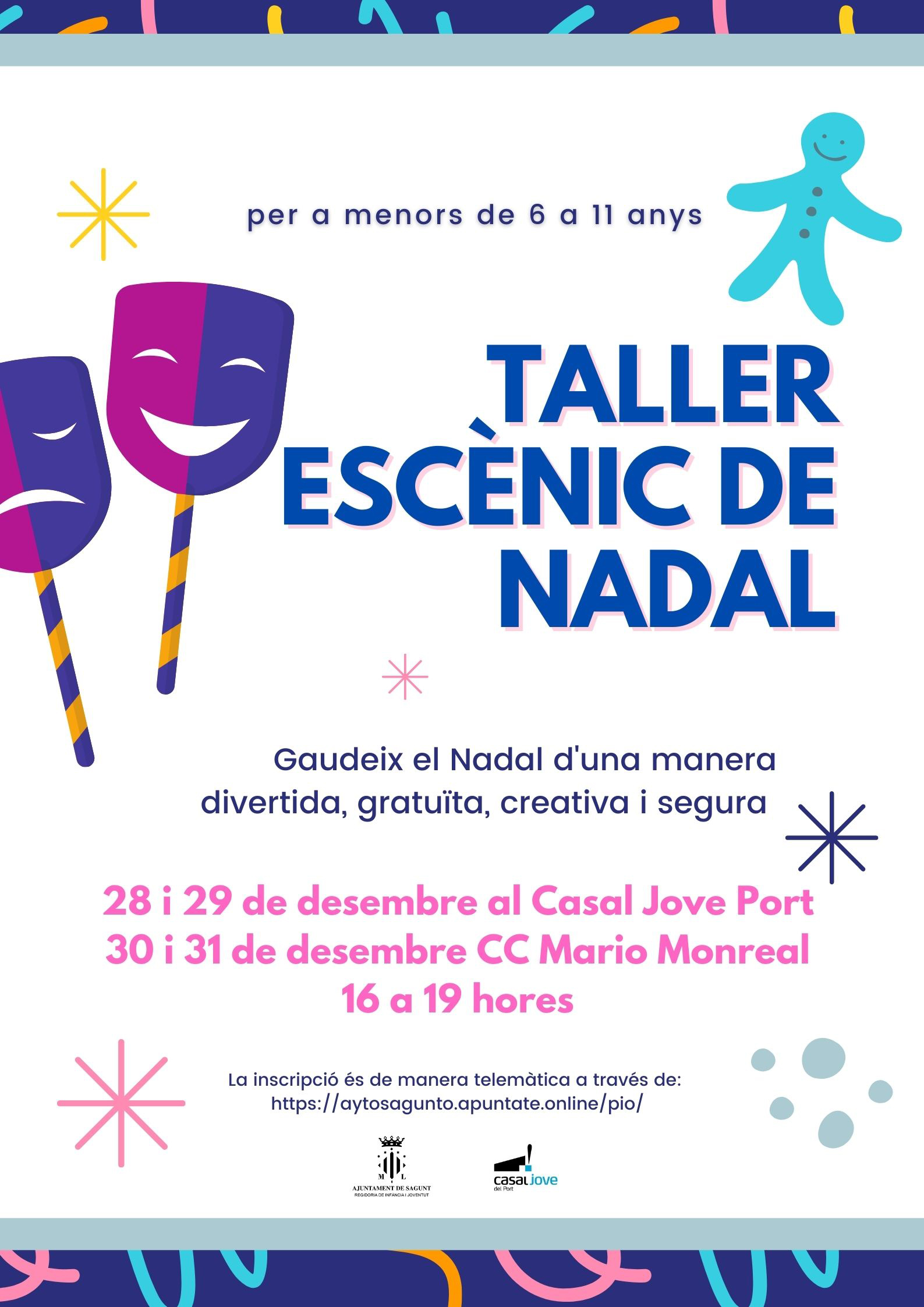 La Regidoria de Joventut i Infància de l'Ajuntament de Sagunt conscient de la importància de l'educació en el temps lliure, ha organitzat el Taller Escènic de Nadal per a l'alumnat de primària de 6 a 11 anys interessat en el joc dramàtic. D'esta manera, ho faran d'una manera divertida, creativa i segura.