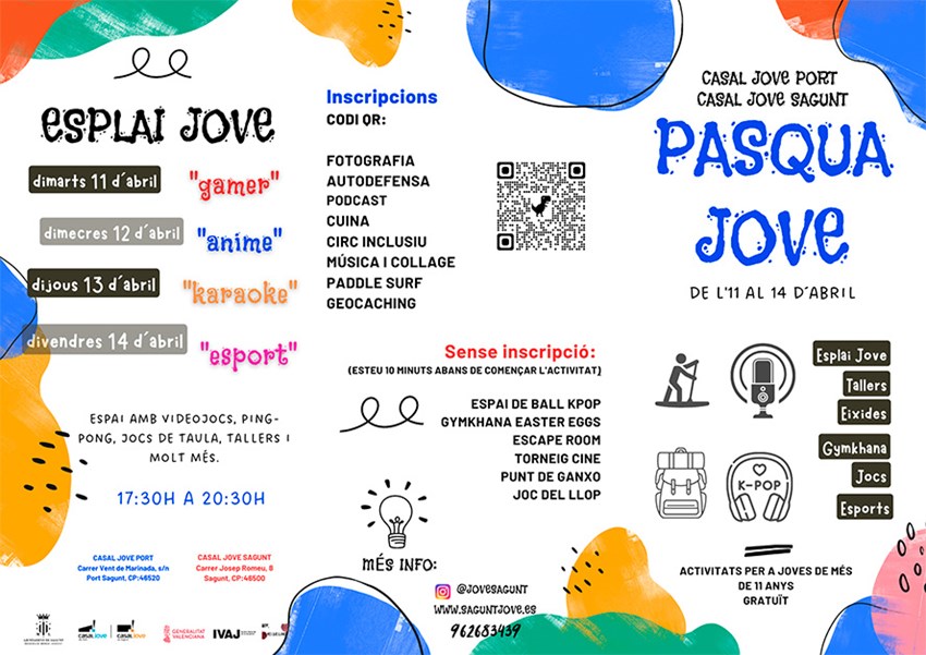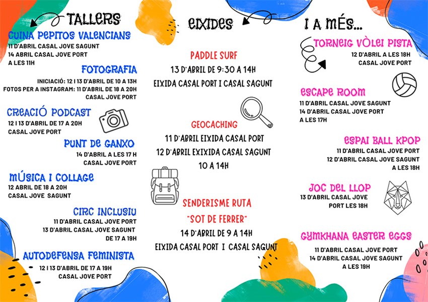 Les activitats de Pasqua Jove es realitzaran de l'11 al 14 d'abril, en horari de demà i de vesprada amb activitats dirigides a jóvens d'entre 11 i 30 anys. Podran endinsar-se en temes mediambientals amb eixides al geocaching Riu Viu, i una ruta a la sendera Sot de Ferrer. Hi haurà activitats esportives com una excursió per a fer paddle surf i un torneig de volei pista per a les persones que es vulguen aficionar en este esport.