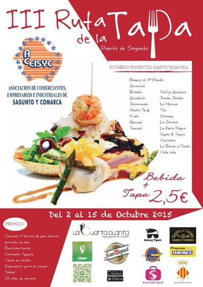 La 3ª edició de la ruta de la tapa se celebrarà en el Port de Sagunt des d’este divendres 2 d'octubre i s'allargarà fins al 15 d'aquest mes. Esta edició comptarà amb la participació d'uns 20 comerços dedicats a la restauració en el Port de Sagunt i es duu a terme gràcies a l'esforç i dedicació de ACEISYC (Associació de Comerciants, Empresaris i Industrials de Sagunt i Comarca) i amb la col·laboració de la Delegació de Turisme de l'Ajuntament de Sagunt.